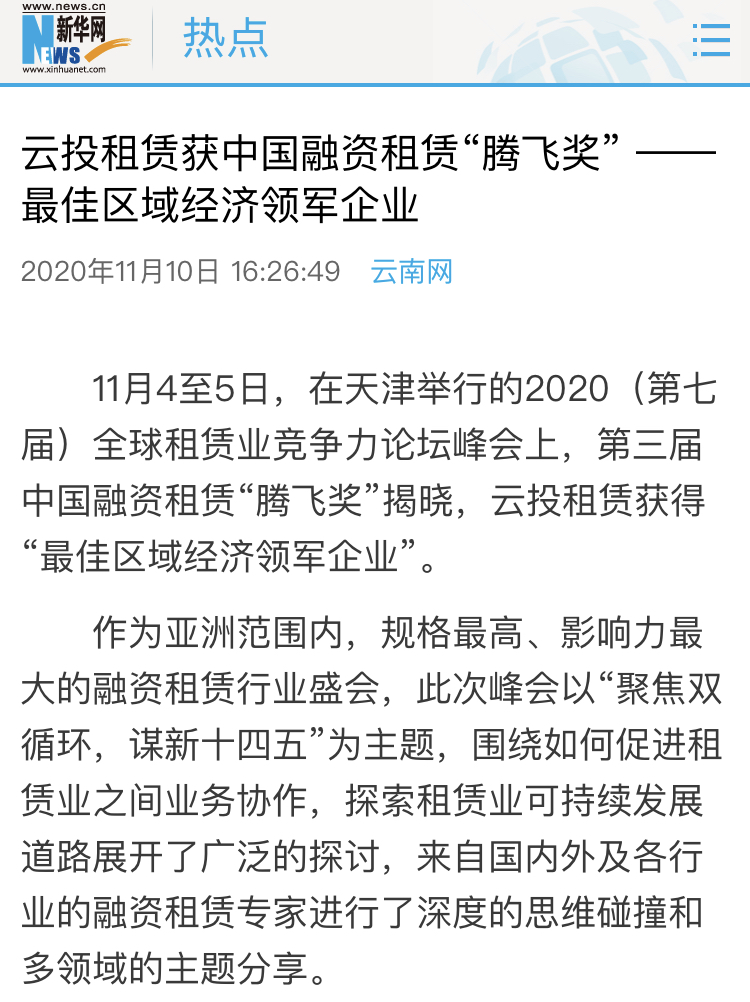 新华网、云南日报、云南网、春城晚报等媒体对云投租赁获中国融资租赁“腾飞奖”进行报道。