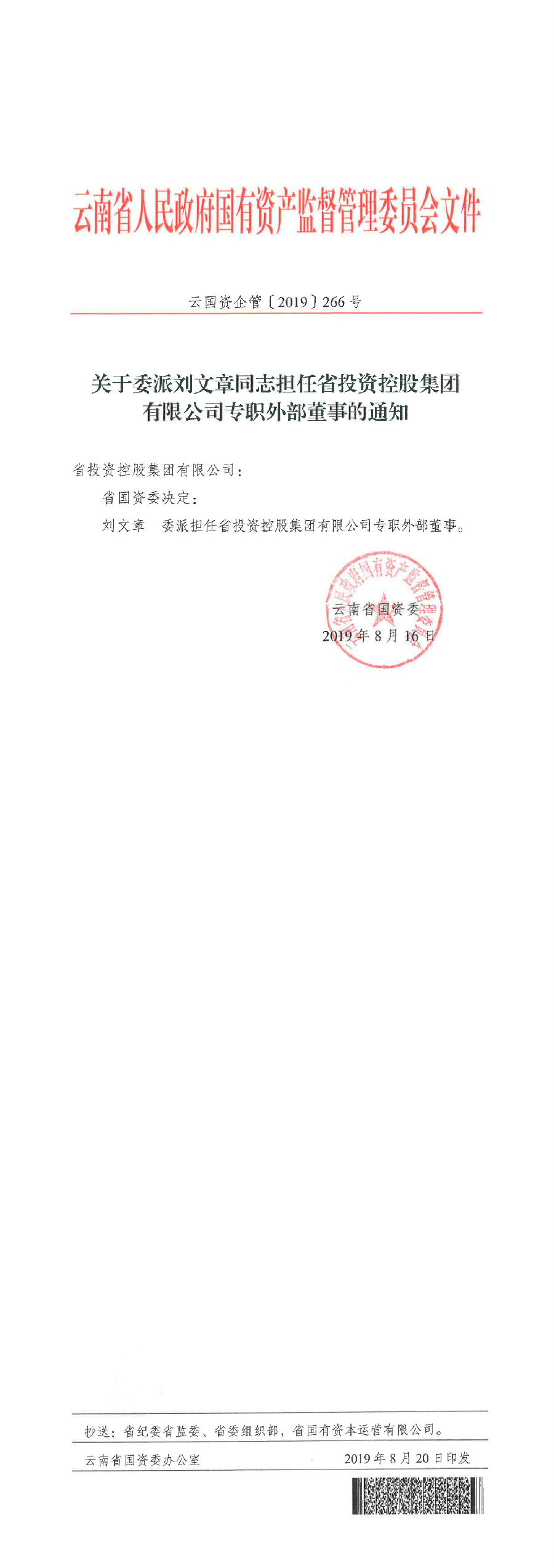 省国资委关于委派刘文章同志担任省投资控股集团有限公司专职外部董事的通知