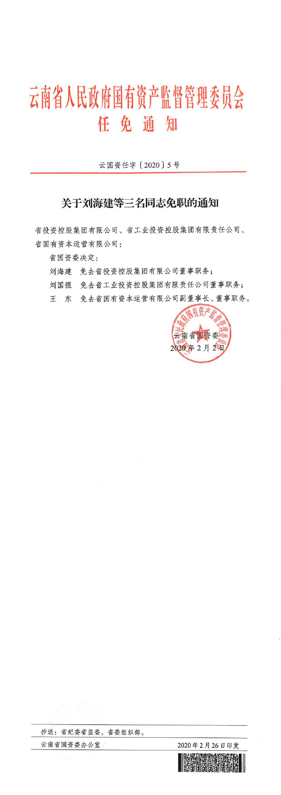 省国资委关于刘海建等三名同志免职的通知