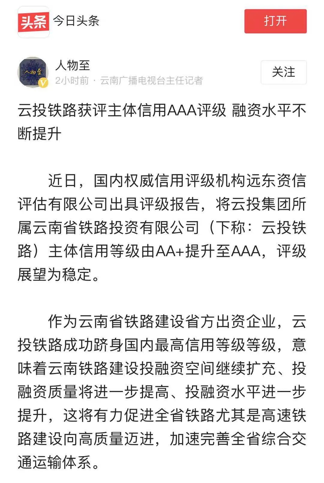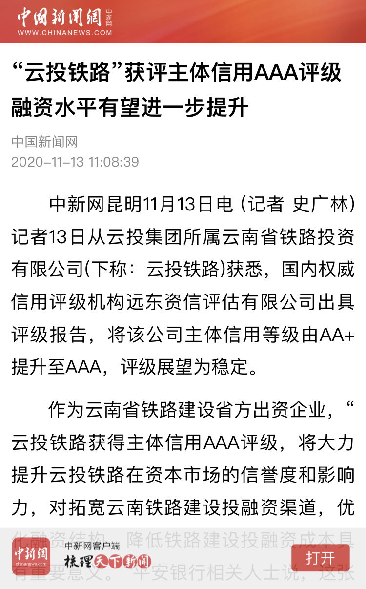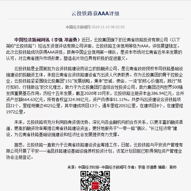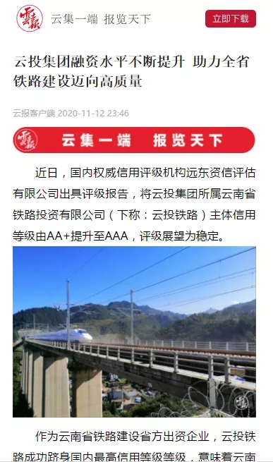 中国新闻网、中国经济新闻网、云南日报、春城晚报、今日头条等媒体对云投铁路获评主体信用AAA评级进行了报道,新浪财经、搜狐网、网易新闻对相关报道进行了转载。