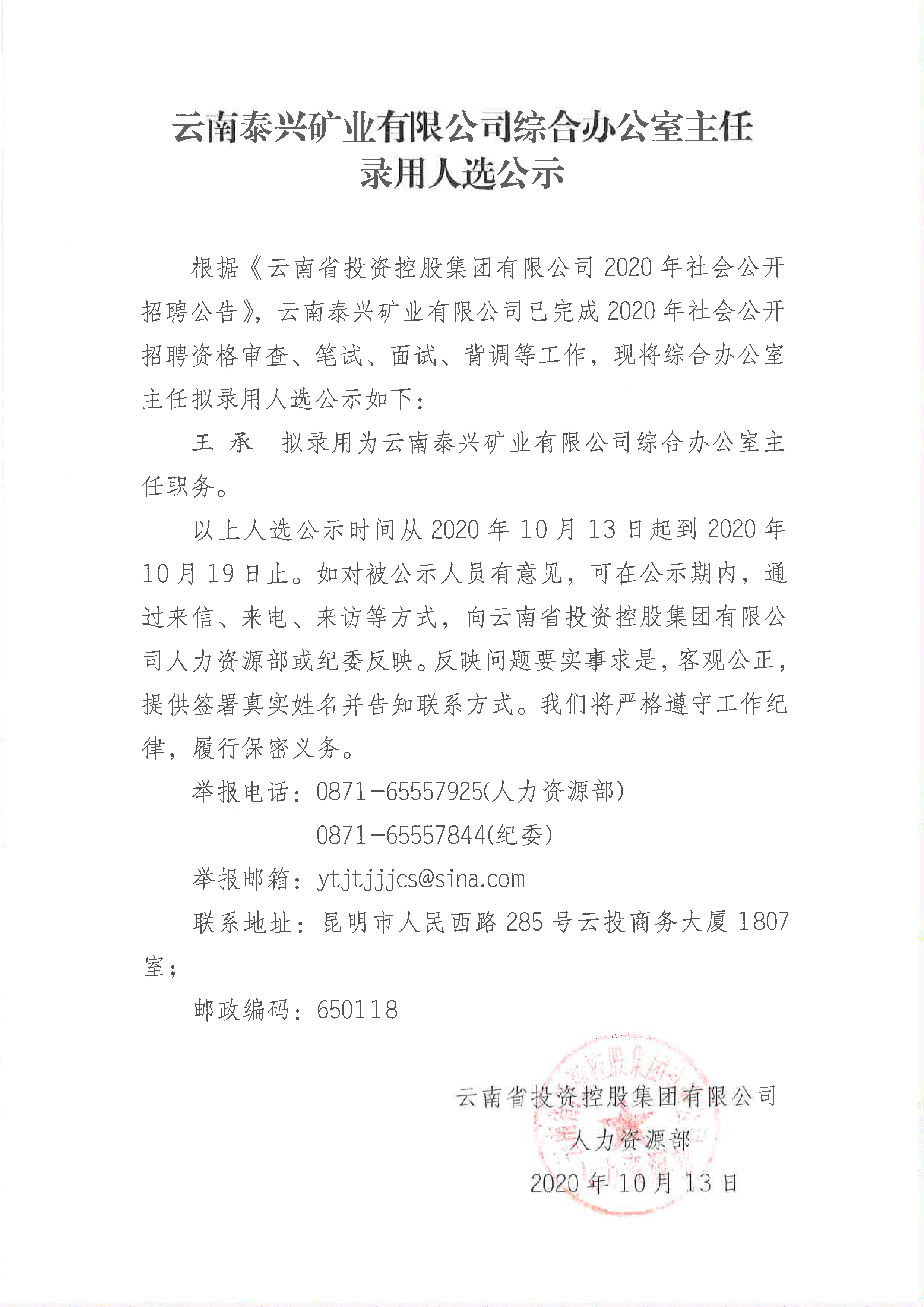 云南泰兴矿业有限公司综合办公室主任录用人选公示